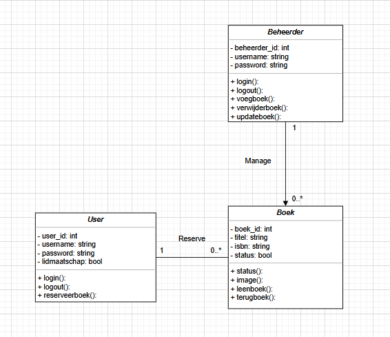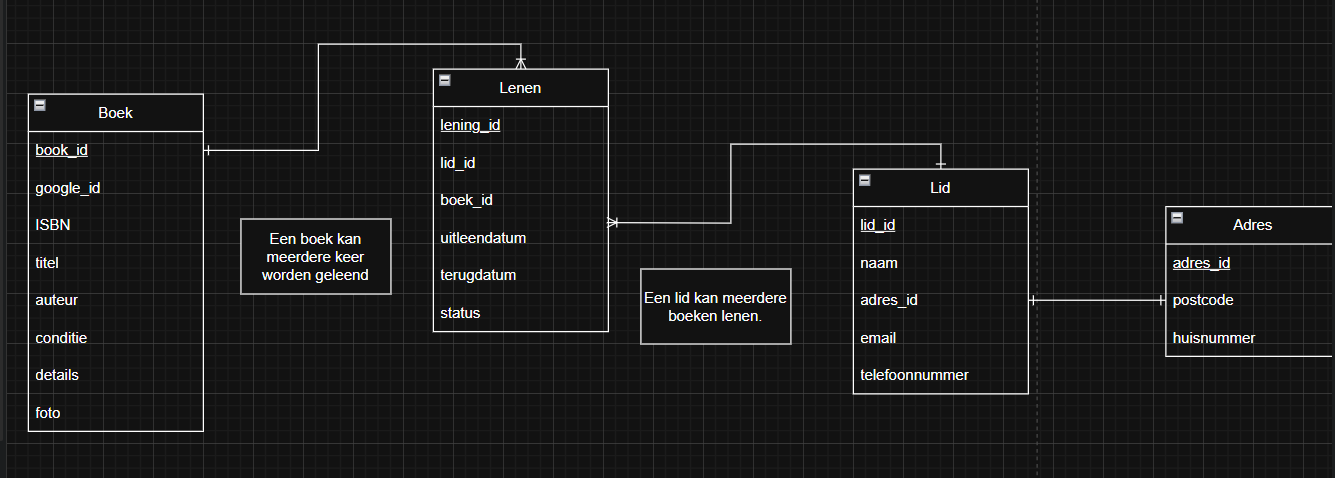 Er is een ERD gemaakt en daaruit was er wat feedback over dubbele data, de feedback is toegepast zodat de ERD correct is. Hierbij was het redundantie belangrijk, als wij data 2 keer opslaan moet het 2 keer geupdate worden, maar als het maar als er geen dubbele data is hoef je het maar een keer uptedaten. Hierbij was er ook een UML class diagram gemaakt met een mogelijke user kant van de bibliotheek. |