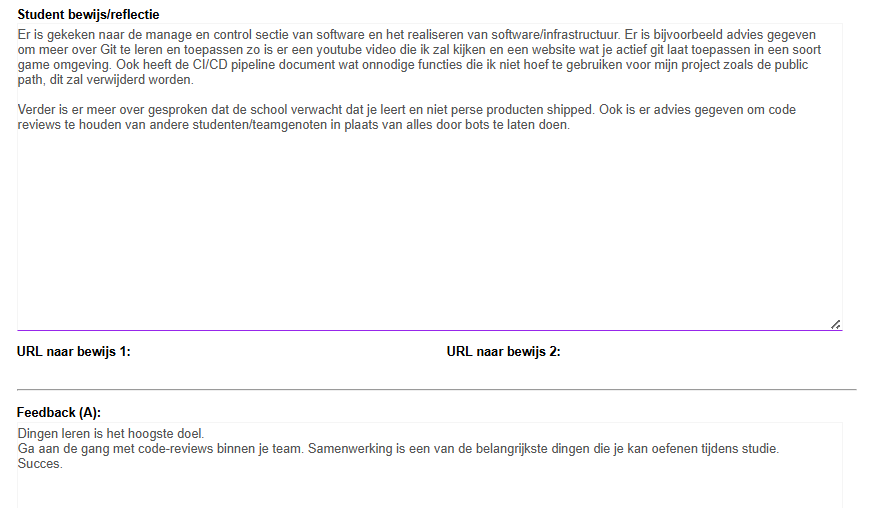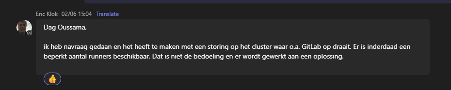 Er was een probleem met de CI/CD pipeline terwijl ik een expert review had op die dag. Ik heb toen een teams bericht gestuurd naar Erik (er was aangewezen als ik problemen heb dat ik het bij Erik direct kan melden) Daarna had ik een bericht gestuurd naar Maarten Post, ik had contact met Maarten over wat de mogelijkheden zijn wij kwamen bijvoorbeeld op het gebruik van mij eigen device as runner. Ik wou persoonlijk mijn device niet connecten met de HVA dus ik heb toen onderzoek gedaan en kwam uit op het gebruik van Oege. Gelukkig was de probleem ook opgelost binnen 24 uur door Erik. |