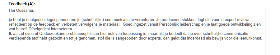 Ik verander mij communicatie stijl op basis van de gebruiker, zo gebruik ik meer formele taal als ik met iemand ouder(een docent) spreek. Maar voor mede studenten comuniceer ik meer casual, dit zorgt er voor dat de gesprekken wat meer open zijn. Verder heb ik me meer ontwikkeld in taal, zo zie ik dat ik wat achter stand had met het uitypen van mijn reflecties. Ik heb gekeken naar hoe ik dit kan verbeteren en kwam uit op een cursus van de HVA & UVA, ik heb die genomen en pas het nu toe dagelijks. |