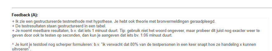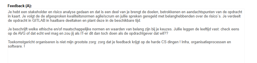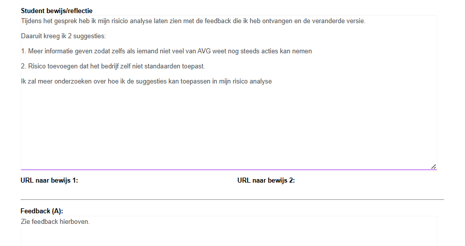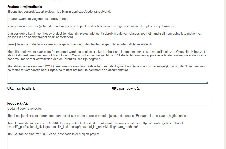 Ik reflecteer op de feedback die ik heb ontvangen, ook pas ik het toe. Meestal verdiep ik me in de feedback die ik heb ontvangen en probeer ik er leerdoelen van te maken om zo mijn werk (en me zelf) te verbeteren. Zo is een voorbeeld van communicatie om meer te socialiceren zodat mijn communicatie skills verbeter. |